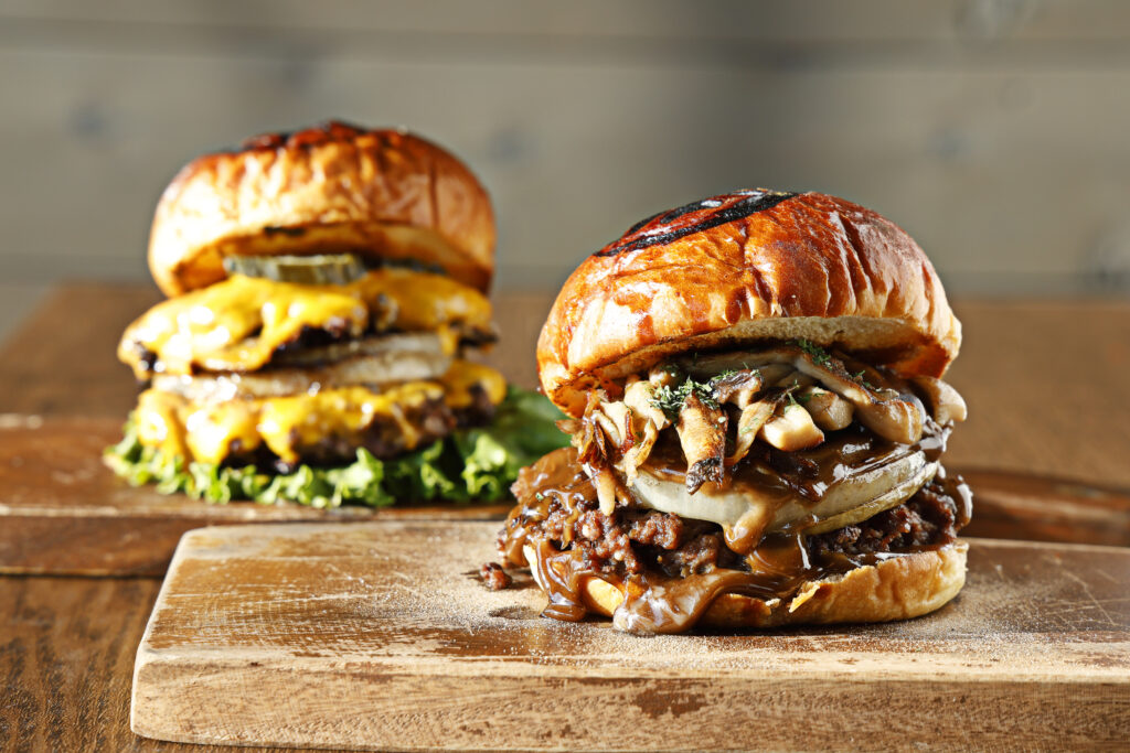 香り高い特製トリュフソースにグリルした舞茸とエリンギを贅沢に使用、常陸牛のラードで仕上げた日本食材を贅沢に使った「黒トリュフバーガー」に、絶対うまい不動の人気No.1!贅沢な素材を包み込む程のチーズを使った絶品バーガー「スタークダブルチーズバーガー」。
